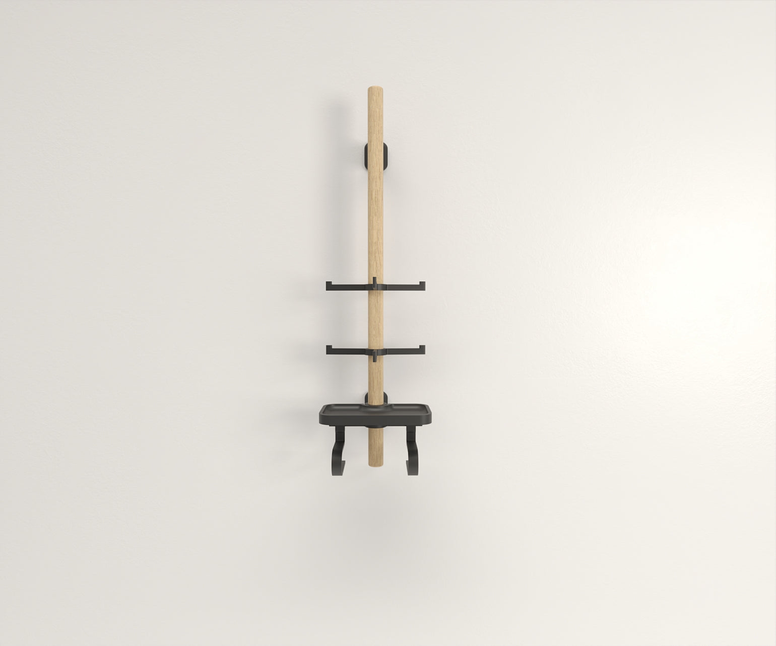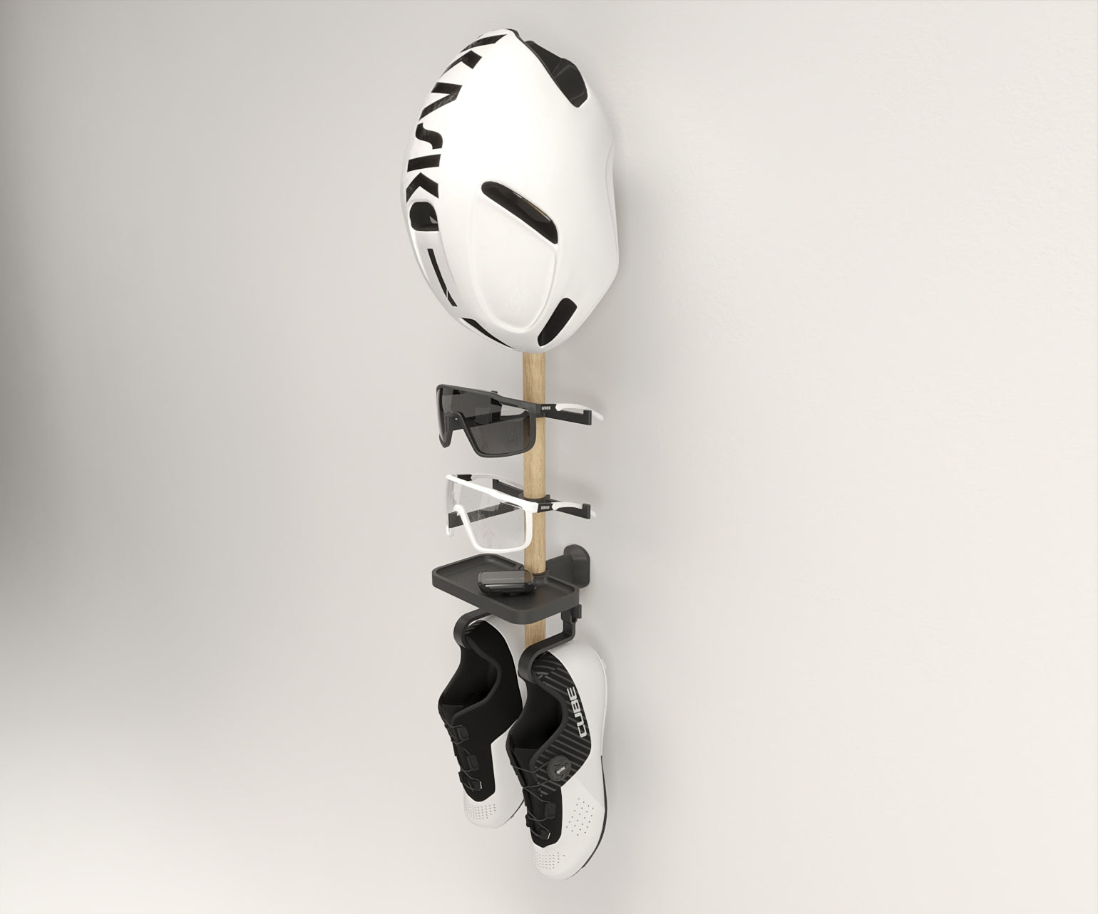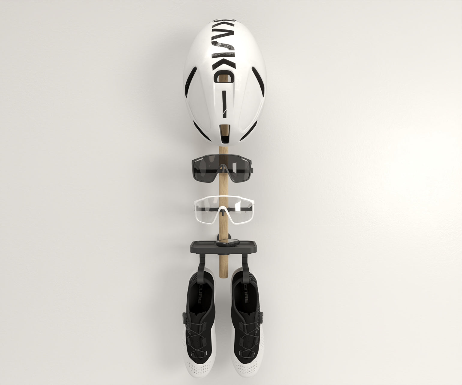 Our minimalist Equipment Pole is designed to be the ideal storage solution for your cycling accessories – whether in your pain cave, living room, basement, or garage. It offers dedicated space for a pair of shoes, 2 x sunglasses, your helmet and a tray for your bike computer